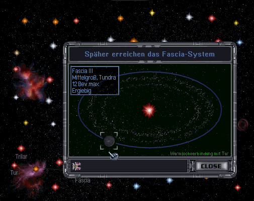 Hinter dem Wurmloch liegt ein mittelgroßer Tundra-Planet. Hier könnten sich die aquatischen Trilarianer durchaus schön ansiedeln, Tundra zählt ja für sie als terranisch. Allerdings sind die meisten Völker eben nicht aquatisch, und da findet man nicht einfach mal so einen terranischen Planeten ohne Monster. Hier kommt der Versuch, eine relativ allgemeingültige Strategie anhand einer speziellen Rasse zu demonstrieren, schon an seine Grenzen. Ich werde das Fascia-System einfach ignorieren.