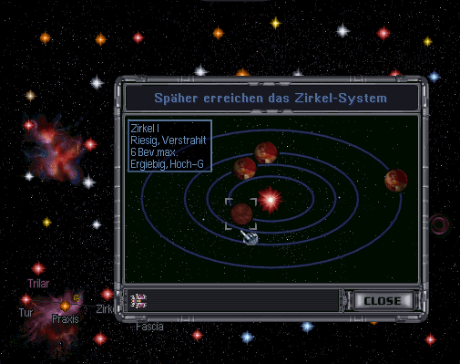 Der verlorene Späher ist schnell durch einen neuen ersetzt. Bei Zirkel finde ich einen weiteren riesigen, verstrahlten Planeten, sehr ähnlich dem in meinem Heimatsystem. Auch dieser so nah an der Sonne, dass er zu Wüste wird statt zu Tundra. Außen drei Gasriesen.