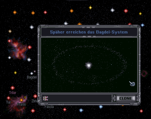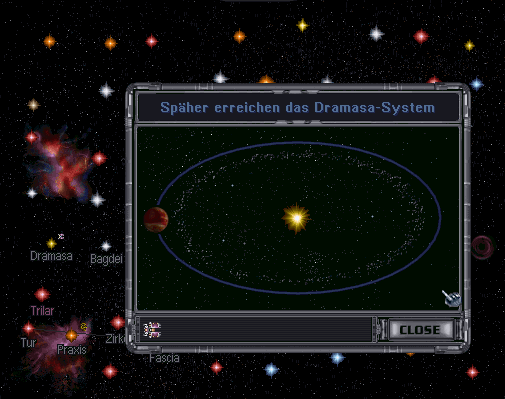 Ein System mit Drache in 4 Parsec Entfernung. Damit hat sich die Gefahr, das Spiel zu verlieren, deutlich verringert. Nicht wegen des Drachen, sondern wegen des Planeten, den er schützt. Hier wird wohl die erste neue Kolonie entstehen. Leider liegt das System mitten in einem Nebel, was ein Problem sein wird, sobald es besiedelt ist. Ein Nebel behindert die Bewegung von Schiffen. Ich werde einen Navigator brauchen, sonst kann ich meine Verteidigungsstreitmacht nicht ausreichend schnell zwischen den Planeten bewegen. Eine Flotte mit Navigator ignoriert einen Nebel einfach.