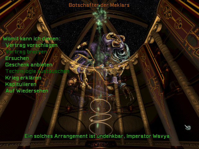 Der erste Kontakt. Die Meklars tauschen weder Technologien, noch gehen sie einen Nichtangriffspakt ein.