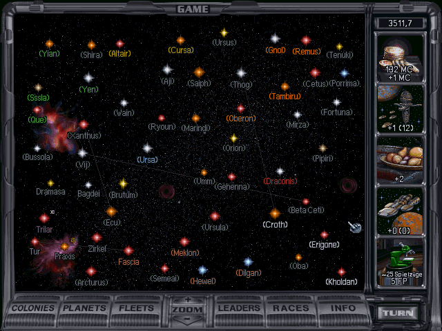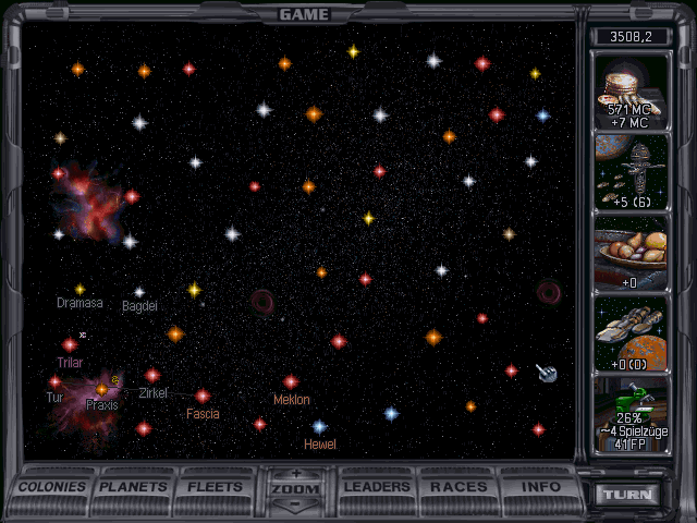 Das gleiche hier. Der Plan für die nächste Zeit ist damit klar: Praxis kolonisieren und dann mal weiter sehen. Ohne das Know-How, einen Drachen früh und billig zu besiegen, könnte das Spiel schwierig werden. Vom Drachen-System abgesehen, ist der 6-Parsec-Radius um die Heimatwelt eine einzige galaktische Wüste.