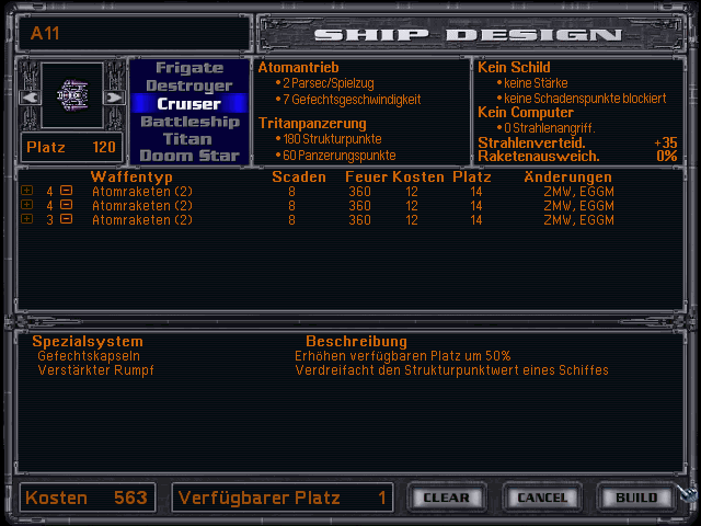 Der Kreuzer ist schnell fertig, es folgt das Material, um Praxis zu besiedeln: Ein Kolonieschiff und sieben Fregatten mit Atomraketen.