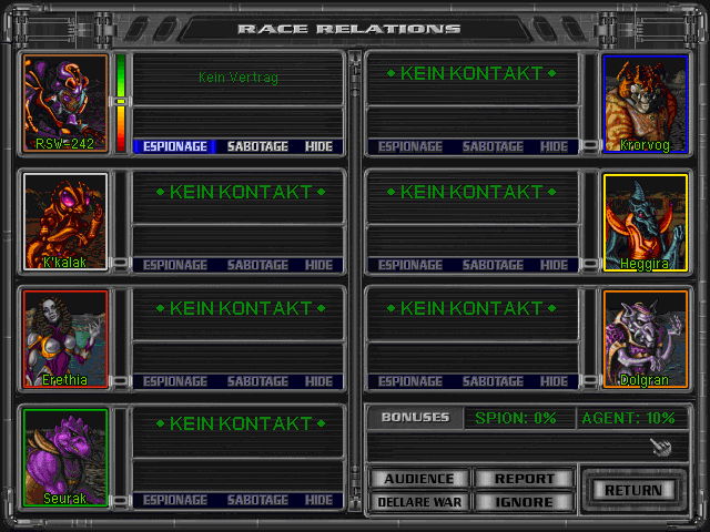 Da haben wir die Gegner; auch das Teil der Überlieferung und nicht normal zu diesem Zeitpunkt. Die Rassen sind in der schwierigsten Stufe stärker als eigentlich spezifiziert, d.h. sie haben zusätzliche Stärken. Die Sakkra und die Klackons sind in diesem Spiel aquatisch. Die Meklars haben die Vereinigung, die Alkari und die Gnolams haben Demokratie (normal bei allen dreien: Diktatur). Die Elerianer sind halbe Mrrshan, nämlich Kriegsherren mit Schiffsangriff +50 (normal: +20). Nicht im Spiel sind die Darlocks mit ihren nervigen Tarnschiffen, das ist gut. Nicht im Spiel sind auch die Psilons, das macht es eher schwieriger, weil weniger Spezialsysteme verfügbar sein werden.