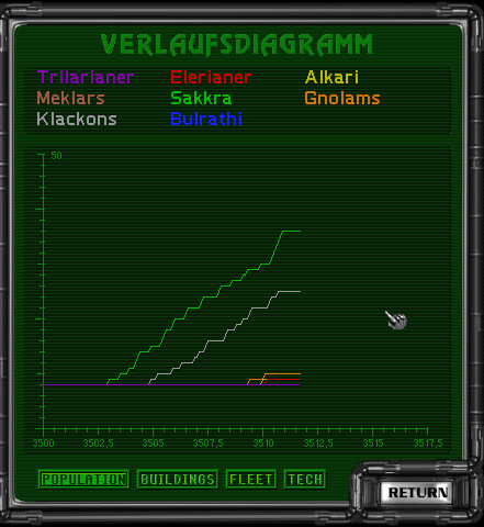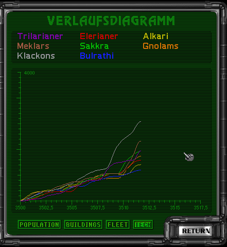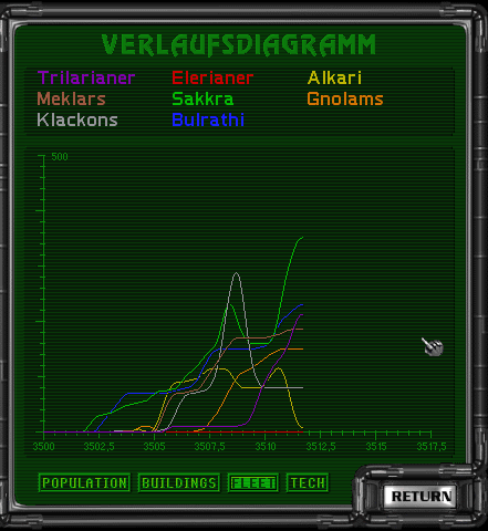 Selten auch der frühe Blick auf vollständige Diagramme. Die unterirdischen Sakkra veranstalten ihre übliche Bevölkerungsexplosion, aber auch die Klackons haben diesmal einen guten Start.