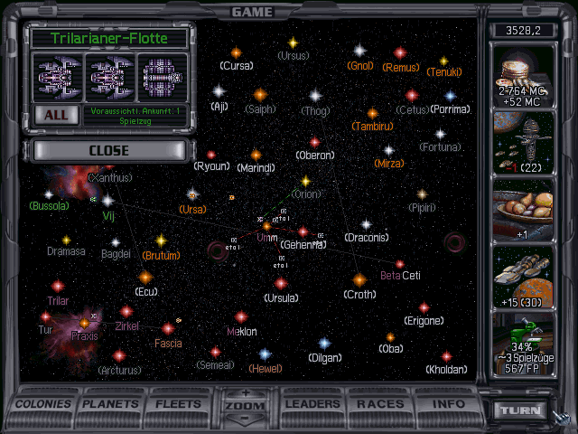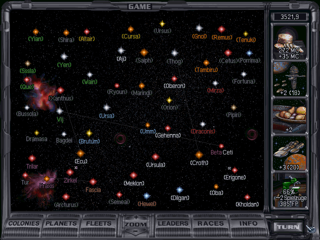 Auch militärtechnisch hat sich die Situation stark verändert. Ich habe zwar durch den Sieg über den Wächter nicht den gewaltigen technologischen Vorsprung erlangt, der mit Glück möglich gewesen wäre, sondern durch Austausch mit den Gegnern "nur" meinen Rückstand bei Panzerung und Computer aufgeholt. Aber schon das wird die Flotte sehr stark machen, da ich intelligentere Schiffe baue als die Gegner, Loknar habe und per Gefechts-Scanner den Erstschlag reserviere. Nachdem in meinen Systemen, nunmehr vier an der Zahl, Warpfeld-Begrenzer installiert sind, kann ich Eroberungen ins Auge fassen. Dafür brauche ich eine neue Flotte, die gegenwärtige ist zu klein und in Anbetracht der neuen Technologien hoffnungslos veraltet. Meine Computertechnologie ist von der schlechtesten auf die beste gewechselt, womit Strahlenwaffen sehr attraktiv geworden sind. Praxis baut sofort einen weiteren Titanen, im Moment habe ich ja nur noch einen. Die Hauptlast der Aufrüstung wird aber die neue, ultra-reiche Kolonie im Orion-System tragen. Sie wird alle produktionsrelevanten Gebäude errichten und dann auf absehbare Zeit nichts anderes tun, als Titanen zu bauen.