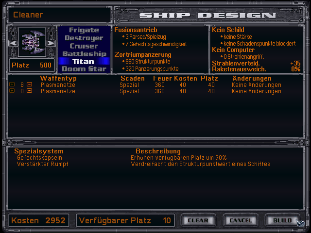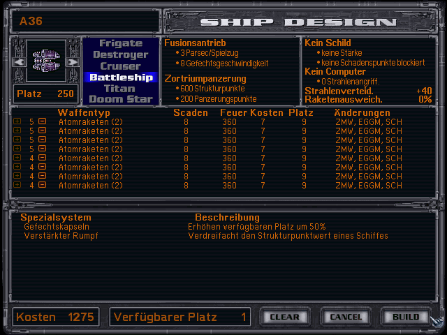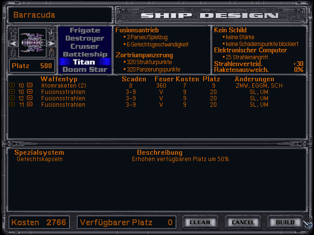 Dieses Schiff wird so wohl nie zum Einsatz kommen, es wird nur gebaut und später aufgerüstet. Die Kosten von 2766 sind auf das spätere Aufrüsten optimiert, daher die skurrile Bewaffnung. Fertigungszeit auf Praxis: 15 Züge. (Nachtrag: Hier Titanen gegen den Wächter zu bauen, war ein Fehler. Da ich keine Schwere Panzerung habe, ist sicher, dass einer davon in der Schlacht zerstört wird. Ich hätte die Variante mit den 10 Zerstörern wählen sollen, die wären billiger gewesen als ein Titan.)