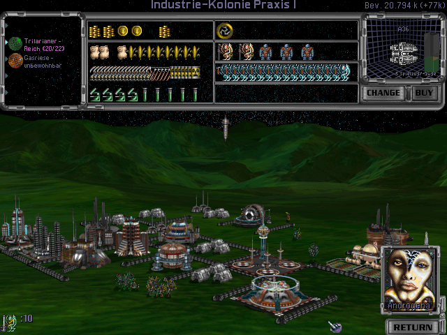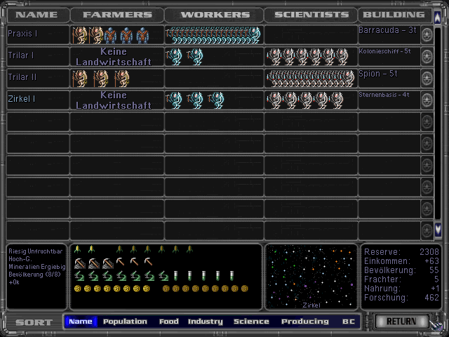 Wie geht es jetzt weiter? Es können Kolonisten in das Orion-System umgesiedelt werden, womit in allen Kolonien wieder etwas Raum für Bevölkerungswachstum entsteht. Außerdem sollte ich eine große Zahl von Spionen bauen, um meine wertvollen und gefährlichen Sondertechnologien vor Diebstahl zu schützen. Ich habe Galaktisches Cybernetz und Astrouniversität durch Tausch erhalten und werde sie in allen Kolonien bauen, was einen beträchtlichen Schub für die Forschungsleistung bringen wird. Die Forschung geht nach dem Warpfeld-Begrenzer weiter mit Antimaterie-Antrieb, Disruptor und, da ich den Hochenergie-Fokus schon habe, mit der Megafluxleitung. Ich sollte auch Androidenwissenschaftler entwickeln, denn damit lässt sich die Bevölkerung meiner beiden riesigen verstrahlten Planeten fast verdoppeln. Außerdem haben ich es nicht geschafft, die Terraformung durch Tauschhandel zu bekommen und sollte sie deshalb jetzt endlich erforschen.