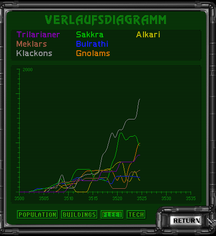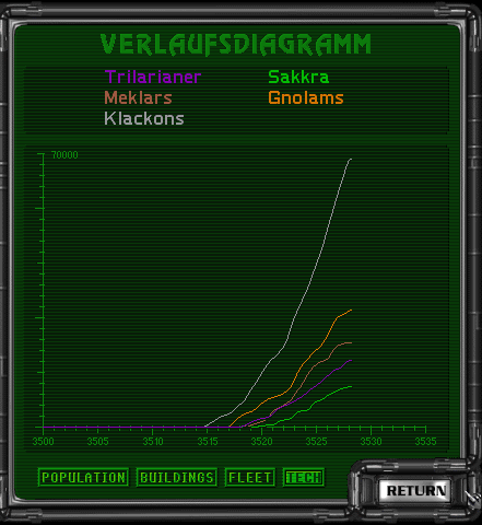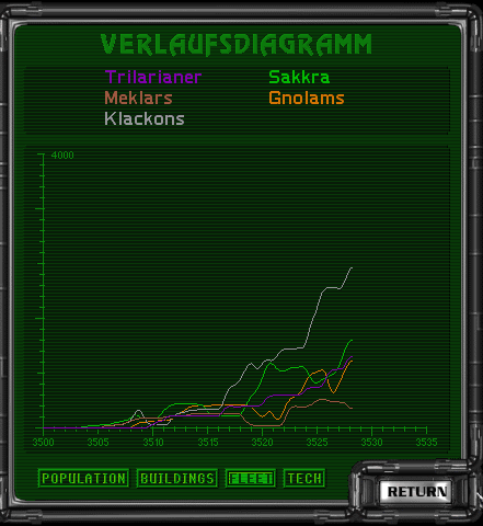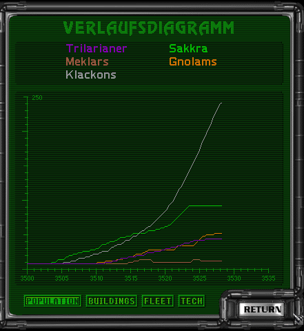 Ein kurzer Blick auf die Diagramme. Hier ist schön zu sehen, dass es nicht unbedingt auf die Anzahl der besiedelten Systeme ankommt. Die Gnolams haben mit ihren sieben Systemen kaum mehr Bevölkerung als ich mit meinen bis eben noch drei. Beängstigend ist allerdings, was die Klackons da treiben. Die Bevölkerung ist absurd...