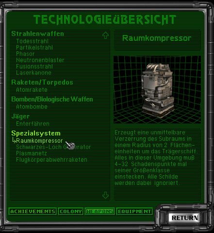 Außerdem bekomme ich den Raumkompressor, wie der Tech-Review zeigt. Der Raumkompressor ist ebenfalls eine nicht-erforschbare Technologie, wie die anderen vier. Das passiert eher selten, meistens handelt es sich bei den verschwiegenen Bonus-Technologien um hochwertige Technologien aus der normalen, erforschbaren Liste.